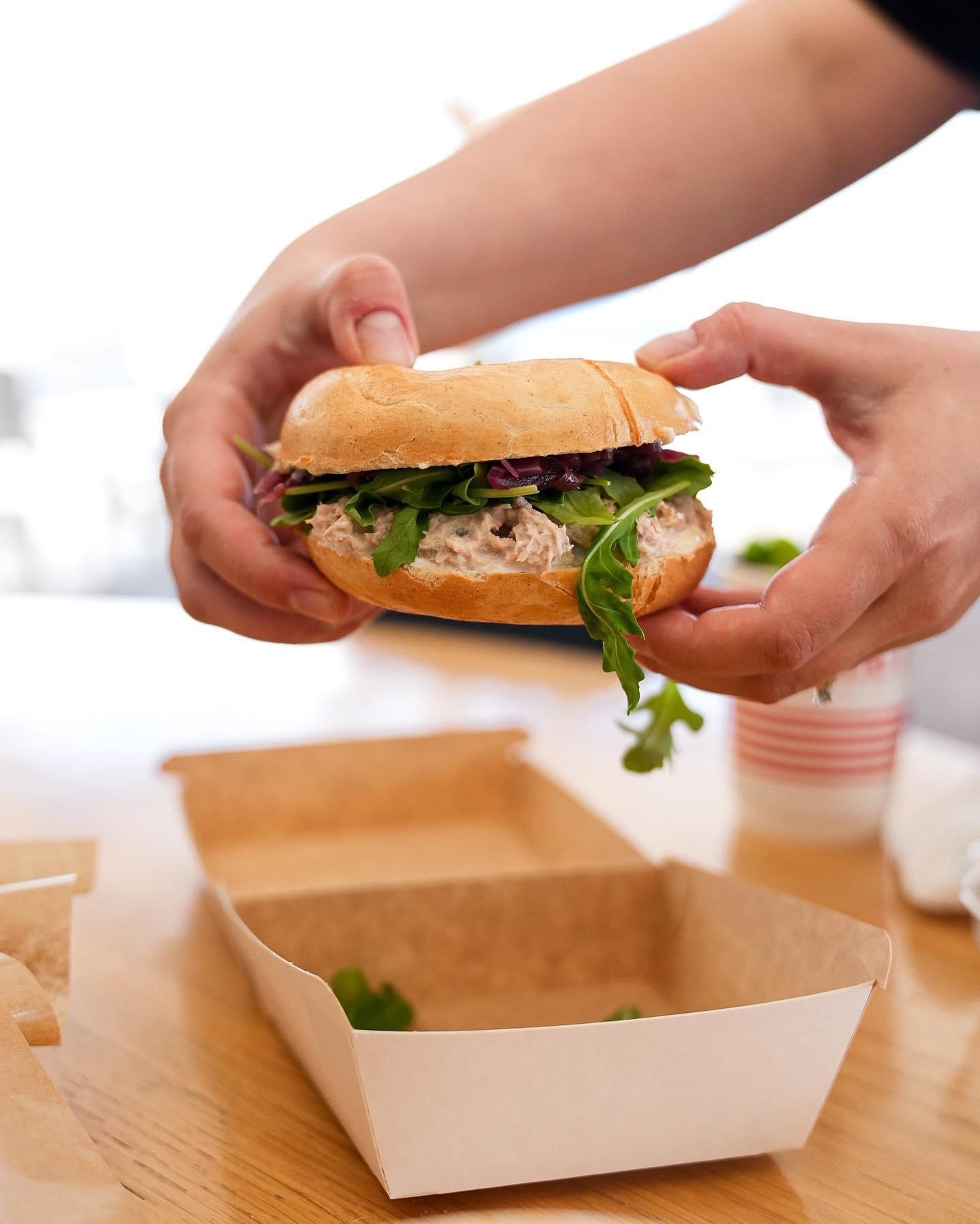 bajgiel/ pasta z tuńczyka/ czerwona cebula/ rukola/ karmelizowana czerwona cebula/ ogórek konserwowy/ majonez